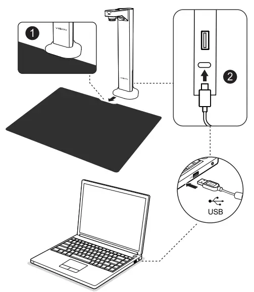 - Place the document camera on the scanning pad and ensure the scanning pad is in contact with the document camera base.
