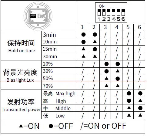 Note: Exit Default hold on time Settings for the sensor is 3 Min, and the background brightness is 20%.Pressing the button triggers different functions for different durationsRefer to the application guide