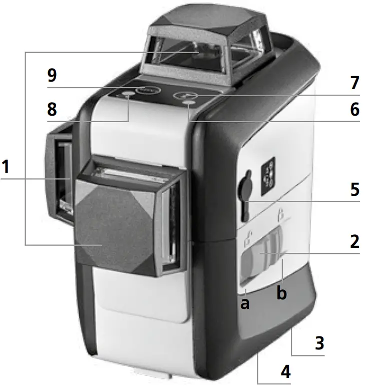 Release the transport restraint, set slide switch (2) to ,,ON”. The horizontal laser line appears. The laser lines can be switched individually with the selection button.