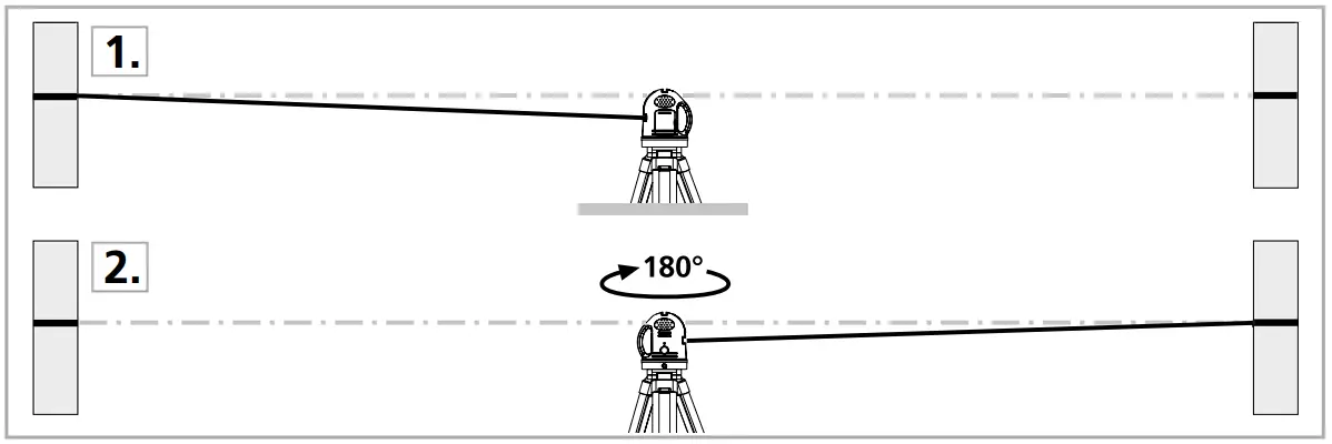 It is possible for you to check the calibration of the laser. To do this, position the device midway between 2 walls, which must be at least 5 metres apart.Switch the device on (Laser cross ON). The best calibration results are achieved if the device is mounted on a tripod.