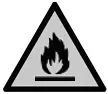 During use, service, and disposal of the appliance, please pay attention to the symbol similar to the one to the side, which is located on the rear of the appliance (rear panel or compressor) and yellow or orange in colour. This is the risk of fire warning symbol. There are flammable materials in the refrigerant pipes and the compressor. Please keep a safe distance between the appliance and fire sources during use, service, and disposal.
