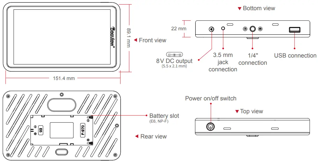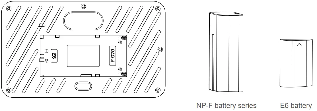 The monitor supports batteries of type NP-F550, NP-F750, NP-F970 and E6.