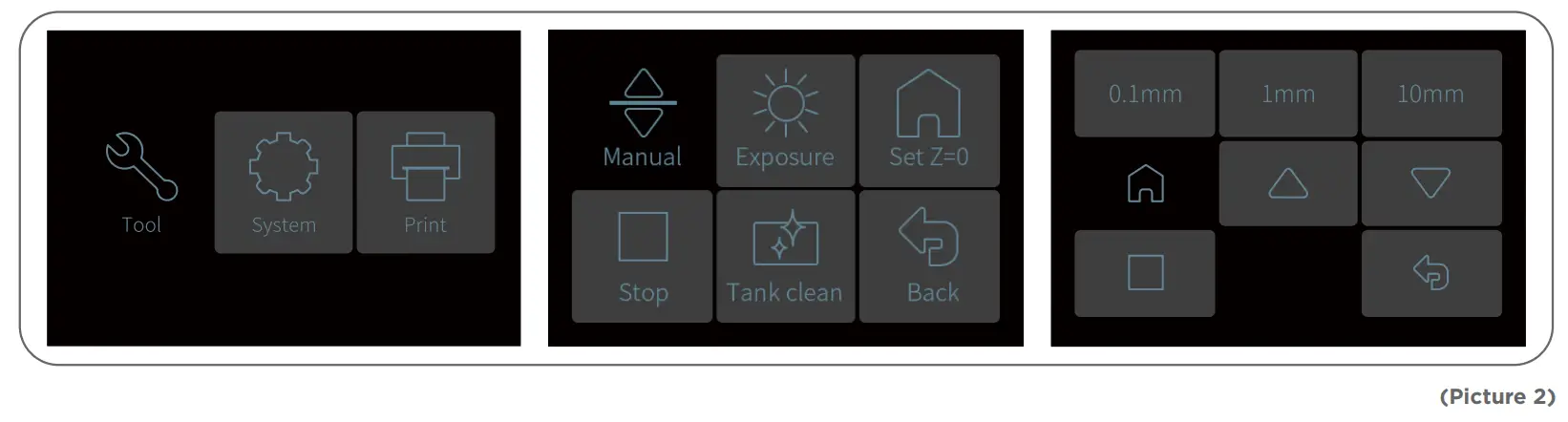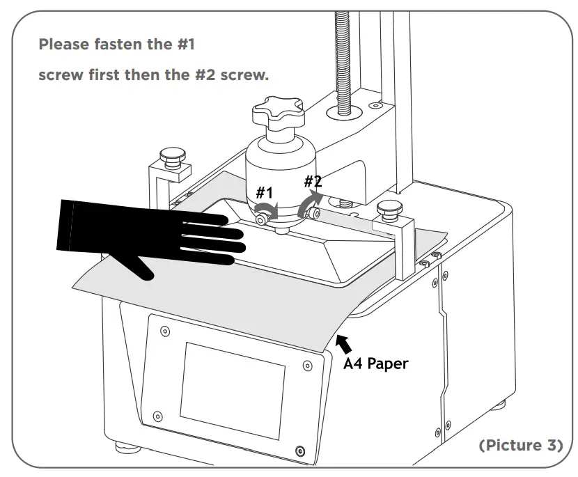 - Remove the resin tank and put an A4 paper between the build platform and 2K LCD screen and click “Move Z axis to zero”. (See Picture 2) When the build platform stops please use one hand to press it and make sure it’s in the central position then fasten it using the Allen wrench. (See Picture 3)
