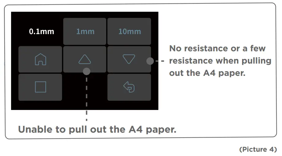 If there is no resistance or only a few resistance when pulling out the A4 paper, click to descend the Z axis at the distance of 0.1mm.