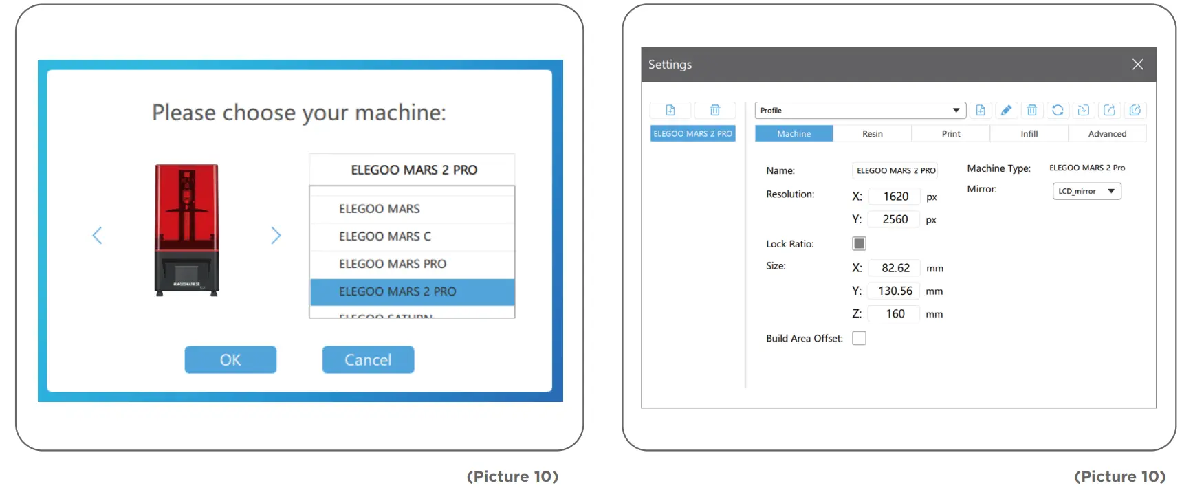 Below are the default parameters and you don’t need to change them. If the model is bigger than printer build volume you would need to change its size with ratio locked. (See Picture 10)