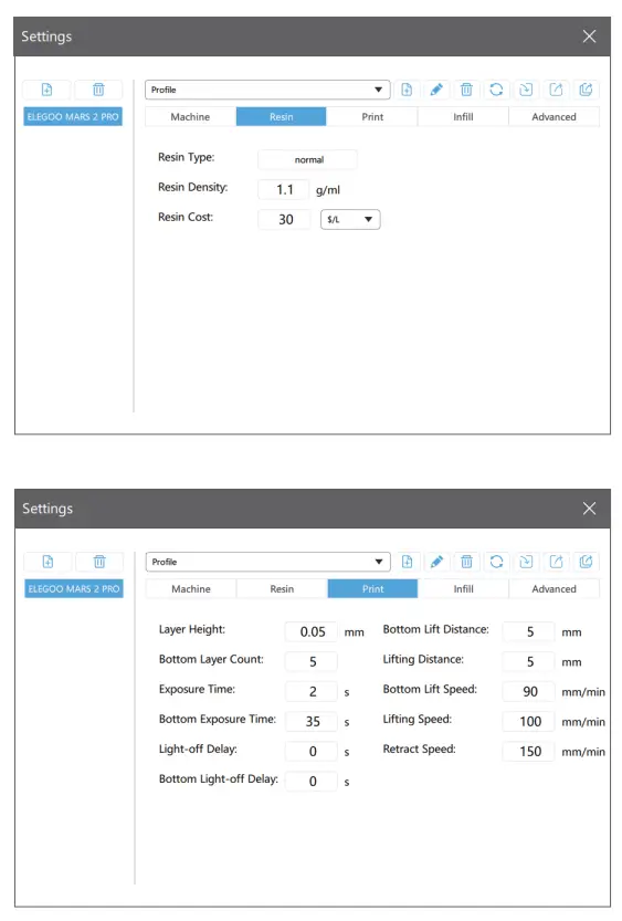 Layer Height: Recommended height is 0.05mm but you can set it from 0.01-0.2mm. The higher you set, the longer time it will take for exposure time of each layer.