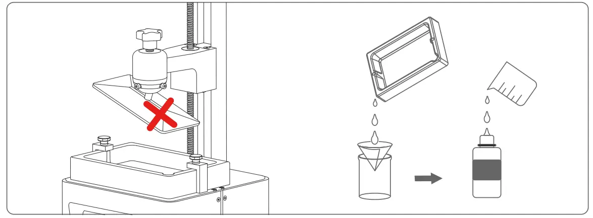 If the model was not completely printed or failed, there might be some residues left in the resin, which can be filtered out using a funnel when you save the rest resin back into its sealed bottle. If you don’t filter out the residues the platform may cause damage to the 2K Photocuring screen when you’re printing next time. As to the left resin on the platform and tank, you can clean and wipe them up using tissues. - Maintenance