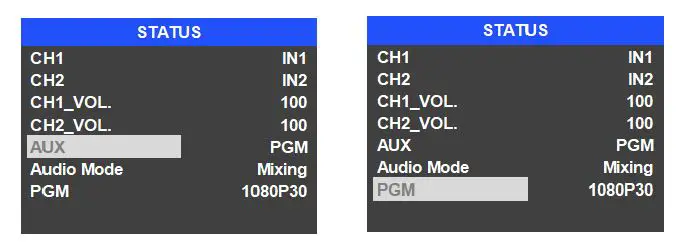 The output format of multiview is fixed at 1080p60, and for PGM output can be set by the knob. Except PVW and PGM output, there is a AUX for choice, you can quickly select the auxiliary output between PVW and PGM via Menu knob. The default setting is PGM after reset. There are resolutions 1080P 50/60/30/25/24Hz, 1080I 50/60Hz selectable for SDI/HDMI PGM and AUX outputs.