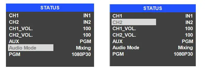 The lower right corner display of the menu and status information. The CH1, CH2 are the channel selection of the 2 audio sources for audio mixer. There is a real-time Digital clock/Analog clock displayed beside the menu.