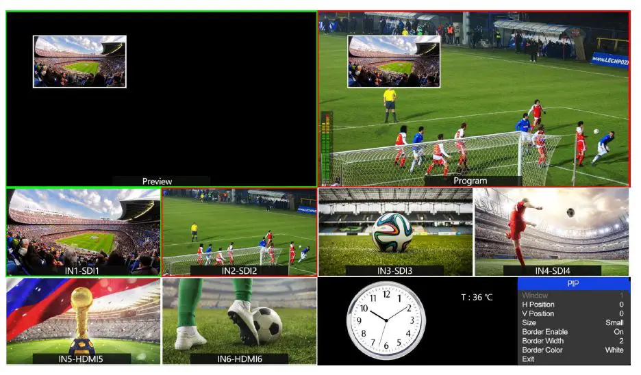 When press PIP, there will be a small image display on the top left corner of PVW window as following image. And the menu will enter an interface as below image. The window size, position and border of PIP can be set from menu.