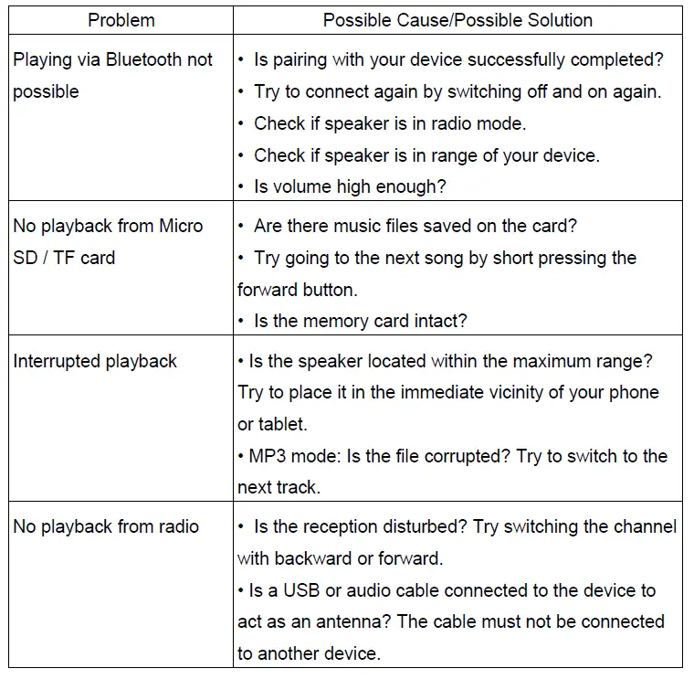 Step 2: After switching on, the device will be in Bluetooth mode (“Bluetooth mode has been on”). You can switch between Bluetooth, radio, line-in or MP3 player operation by pressing the mode button “M” shortly. If the speaker has been connected to a phone during prior usage, the connection will be automatically established in Bluetooth mode.