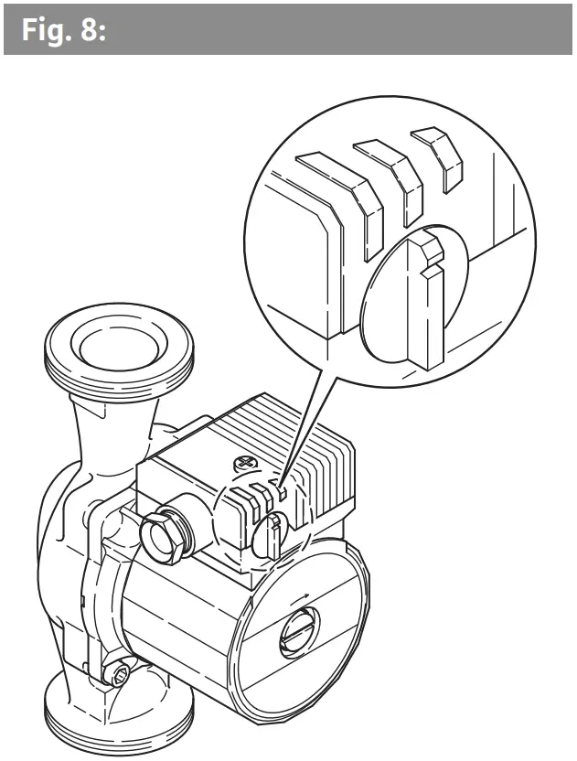 | Motor is blocked, e.g. due to deposits. | Unscrew the venting screw completely and check the ease of movement of the pump rotor or make it easy to move by turning the slotted end of the shaft with a screwdriver (fig. 9). ATTENTION! Close the shut-off devices upstream and down- stream of the pump at high water temperatures and system pressures. Allow the pump to cool down first. | |