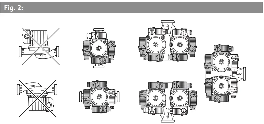 - Install the pump with the pump motor horizontal and free from mechanical tension. See fig. 2 for installation positions of the pump.