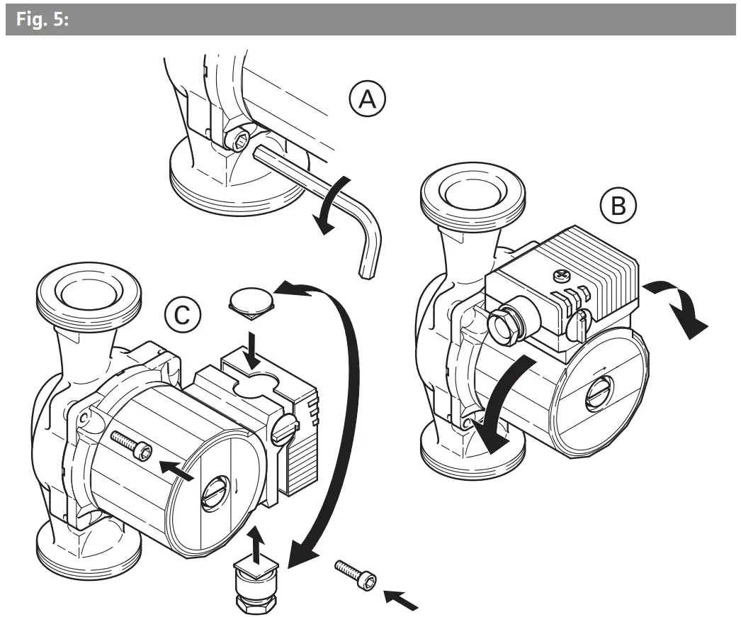 Note: In general, turn the motor head before the installation is filled. When turning the motor head in a system that has already been filled, do not pull the motor head out of the pump housing. Turn the motor head with a small amount of pressure on the motor unit so that no water can come out of the pump.