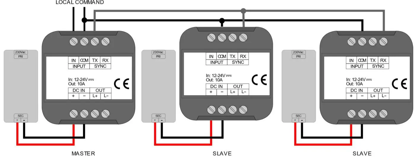 - Using one power supply every single dimmer, first power on the Master unit and after that give power to the Slave.