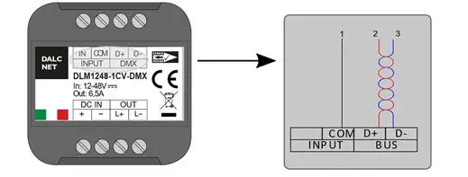 - connect the power supply (12-24 Vdc or 12-48 Vdc depending on the dimmer model) to terminal blocks “DC IN” of the device.