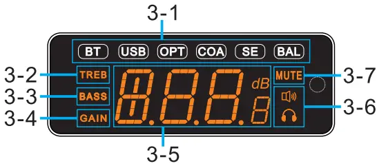 Screen display Description 0-1 Power amp output 0-2 Headphone amp output 0-3 Power amp & Headphone amp output (default) - Treble setting (Available for remote control setting)