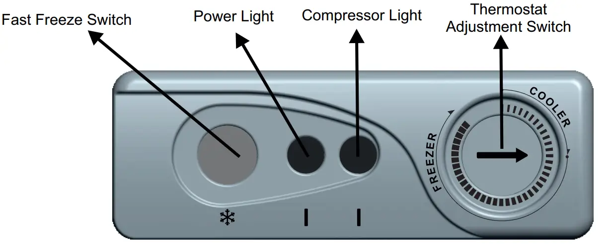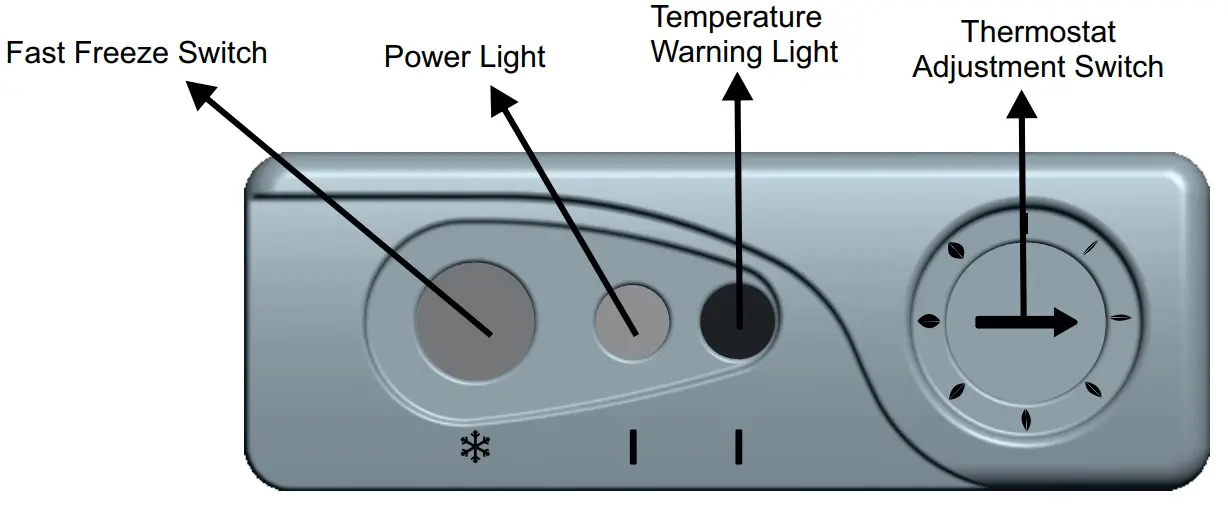 WARNING: When the fast freeze switch is pressed, the compressor runs continuously and thermostat will remain deactivated. If this switch is pressed for a long time, this can lead to more energy consumption or a compressor failure.