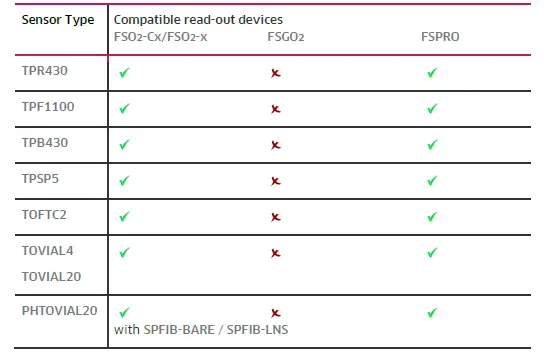 | Sensor Type | Compatible read-out devices FSO2-SUBPORT PICO-T-SUB APHOX-x |