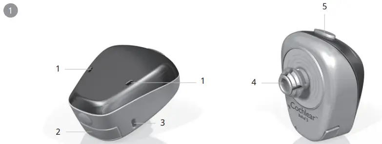 Note on figures: The figures included on the cover correspond to information specific to this model of sound processor. Please reference the appropriate figure when reading. The images shown are not to scale.
