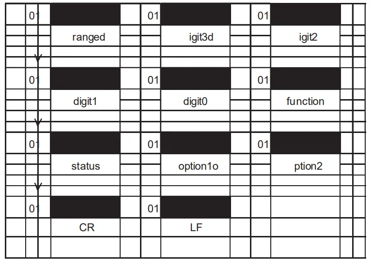 Digit 3 is the most significant digit on the LCD panel, and digit 0 is the least significant digit. When the LCD panel shows OL, the serial port outputs 4000.Digit Code 0 0110000 1 0110001 2 0110010 3 0110011 4 0110100 5 0110101 6 0110110 7 0110111 8 0111000 9 0111001 - STATUS