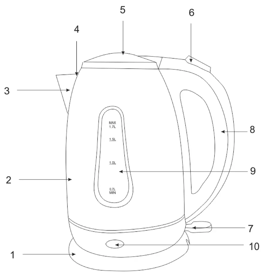 - Do not fill the kettle with less than 0.7 l of water (less than “MIN” mark) to prevent it from operating dry and more than 1.7 l (up to “MAX” mark) to avoid overfilling and water spilling out during the boiling.