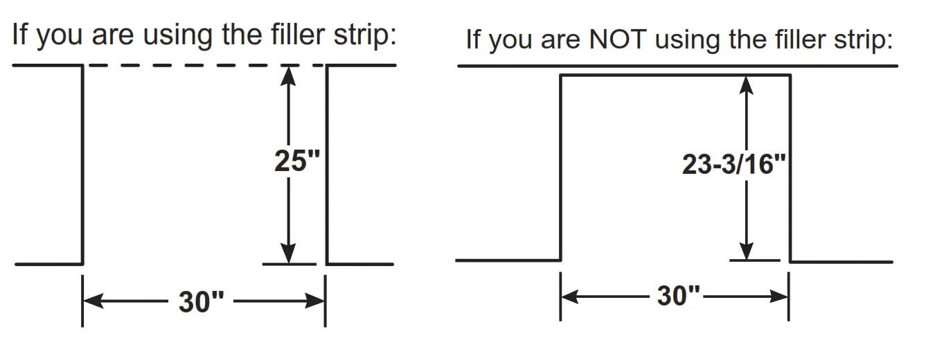 IMPORTANT: 30″ DROP-IN RANGES ARE DESIGNED TO HANG FROM THE COUNTERTOP. IT DOES NOT REST ON THE FLOOR. FOR INSTALLATION ALTERNATIVES, REFER TO INSTALLATION INSTRUCTIONS. If you are NOT using the filler strip: 23-3/16″