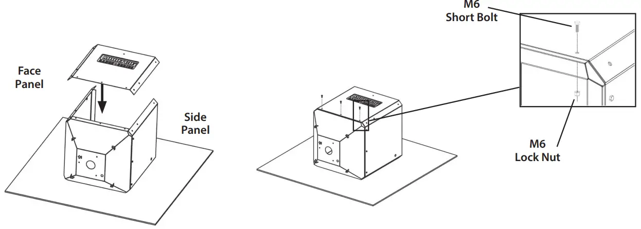 Place a face panel on top of the cone and overlapping the side panels. Align the bolt holes in the cone with the (3) lower holes in the face panel. Secure using (3) Short M6 Bolts and (3) M6 Lock Nuts. Hand tighten only.