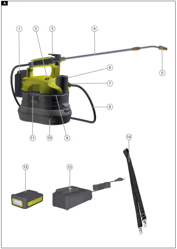 The cordless pressure sprayer is intended for outdoor use in a well-ventilated area. The product is for spraying household and garden chemicals such as insecticides, fungicides and fertilisers. The product can also be used for watering plants. Do not use the product for purposes other than those mentioned above. The product must not be used by children or by persons who are not wearing adequate personal protective equipment and clothing.