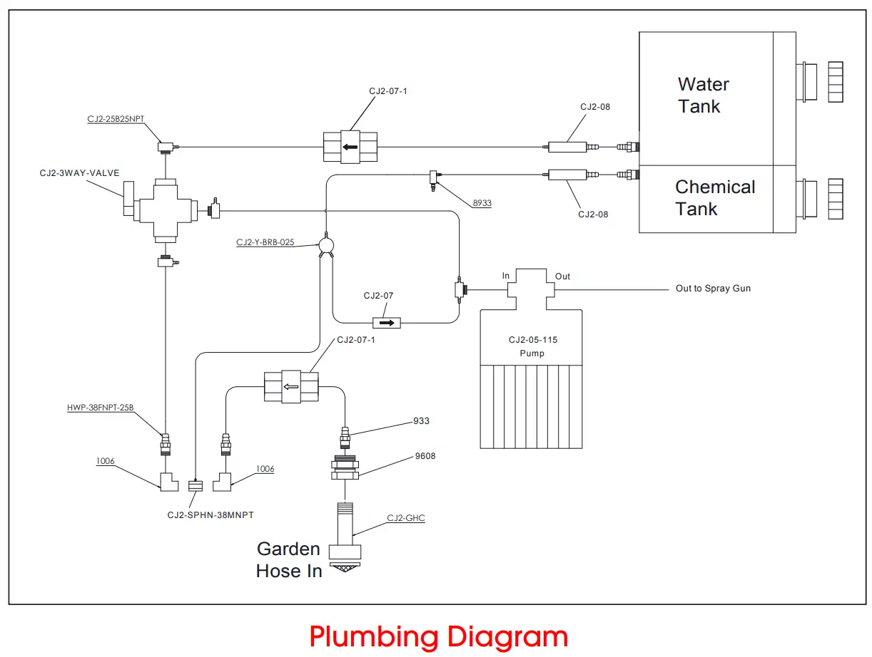 - Fill the water and chemical tanks. Before priming the pump, make sure chemical valve is fully closed.