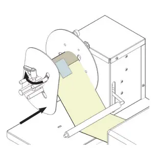 - When the printer forwards the media for printing, the tension arm goes down, the device rewinds the printed media. Yellow or green led on depending on the selected rewinding mode (face-in or face-out).