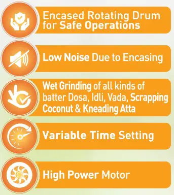 - Suitable for making dosa and idli batter, scraping coconut and kneading atta.