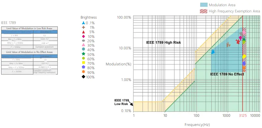 Marks in the right chart are tested results of different current levels. The output frequency is 0Hz in 100% brightness and its corresponding modulation is 0%, which could not be shown in the right chart.