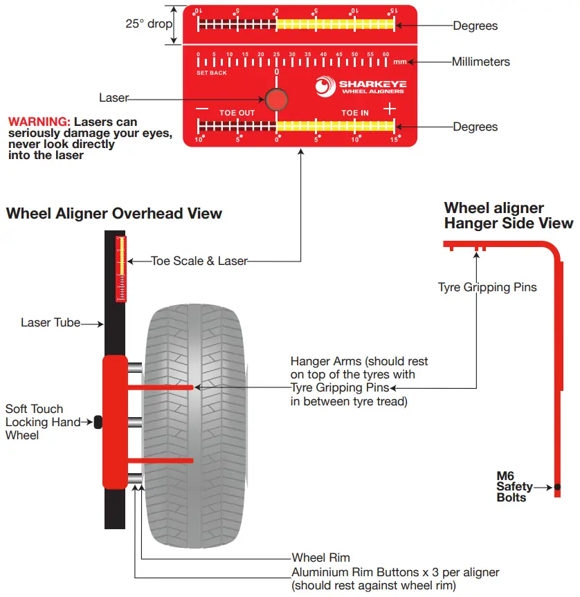 Hang the laser heads onto the tyres and ensure the three aluminium rim buttons are touching the wheel rim. Set the spirit level on both of the laser heads. - Switch on both lasers on each laser head so both lasers are pointing at each toe scale, this will give you your measurement reading.
