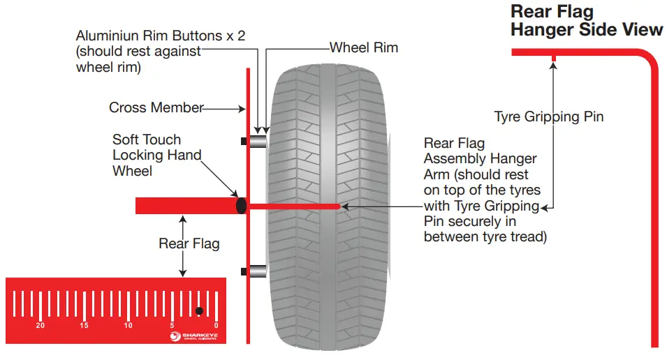 To install the flag scale assembly hang the assembly from the top of the tires tread surface. The vertical round rod should be visually perpendicular fore and aft to the floor surface. Adjust the two lower aluminium stand-off pins firmly against the wheel’s edge. The flag scale should face toward the other axle and be positioned parallel with the tires tread surface. Move the top of the round vertical rod in toward the sidewall or out away from the side-wall until the level vial bubble is roughly centred. Both aluminium pins on this assembly are used for toe-tracking. The flag scale assembly should not be used to reference camber measurements.