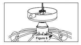 - Reinstall the hanger ball on the downrod as follows. Route the black, white, red, blue wires and safety cable through the hanger ball. Position the pin through the two holes in the downrod and align the hanger ball so the pin is captured in the groove in the top of the hanger ball. Pull the hanger ball up tight against the pin. Securely tighten the set screw in the hanger ball. A loose set screw could create fan wobble. (Figure 6)
