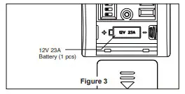 Do not operate this fan with a variable (Rheostat) wall controller or dimmer switch. Doing so could result in damage to the ceiling fan’s remote control unit. - To make fan operational, install 23A/12V battery (included) in hand-held remote transmitter, with fan power off. Then follow the remote code setting process. (If not used for long periods of time, remove battery to prevent damage to transmitter). Store the remote away from excessive heat or humidly. (Figure 3)
