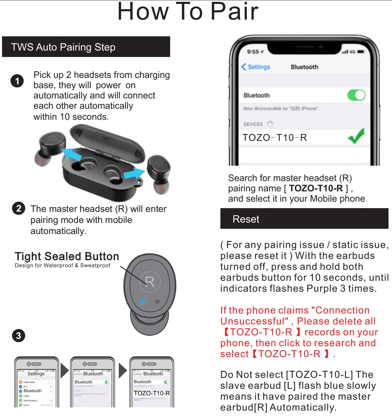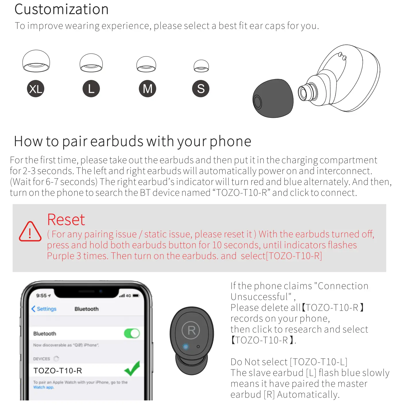 In order to make sure that you can smoothly use the TOZO T10 true wireless stereo headset, please kindly find below some important use instruction and possible trouble shootings.