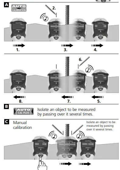 - Tip 1: The position between the two markings is the mid-point of the metal object. Through the high measuring sensitivity, thick metal objects appear broader than they are in real life. Therefore move the device over the newly found object as shown in Image B. The device is calibrated automatically during this process. Manual calibration should be performed near the place found last as shown in Image C. Repeat this step as needed.