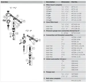 | Retrofit version without rotatable connector piece, filter mesh size 95/110 μm, lead-free materials (for DA74CS- xxLFA rotatable connections 1 1/2″ – 2″) | – | – | • |