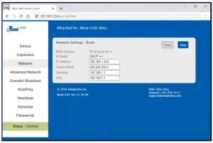 then Network. Enter the new IP Address, Subnet Mask, Gateway and DNS, then click Save. Click the Reboot button (or press the reset button next to the power outlet LED) to restart the iBoot-G2+ with the new settings. To lock the settings, select IP Mode = Static. If IP Mode remains or is programmed to DHCP, the iBoot will obtain an address from a DHCP Server as soon as it finds one.