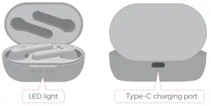 - The earphones automatically turn on(with blue LED light flashing) and start pairing when you open the charging case.