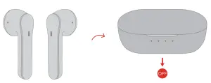- In the shutdown status and when the earphones are not in the charging case, simultaneously press and hold the MFB of both earbuds for 2 seconds to power on ( with the blue LED light flashing).