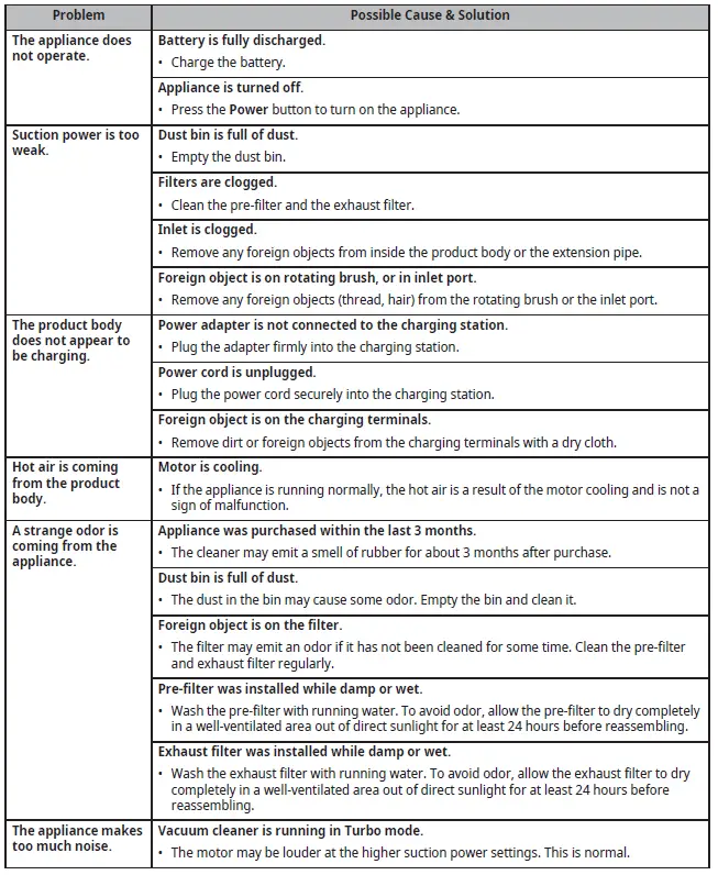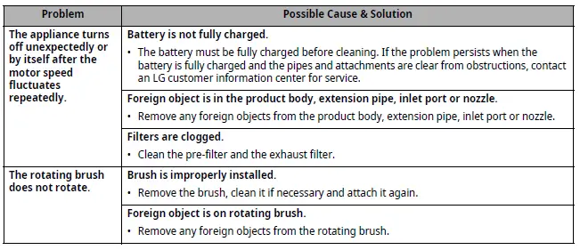 - If the sound of the appliance becomes loud or the cleaning performance is poor, check for foreign objects.