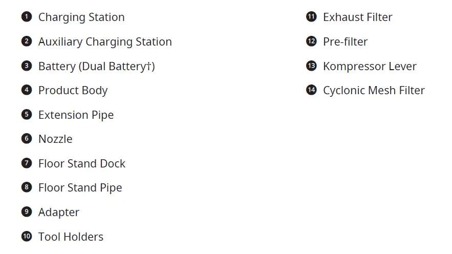 - Check the inside of the product body, above the Kompressor working plate, the extension pipe, inlets, exhaust filter, pre-filter and cyclonic mesh filter for foreign objects.