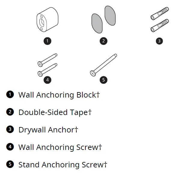 - To prevent tipping, self-standing mode installations should be anchored to the wall using the provided stand anchoring screw, anchoring block and double-sided tape.