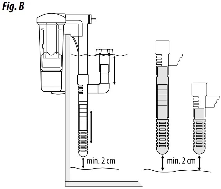 Fig. B Extend the inlet tube as far as possible. Leave at least two cm’s of space between the inlet strainer and the bottom of the aquarium.