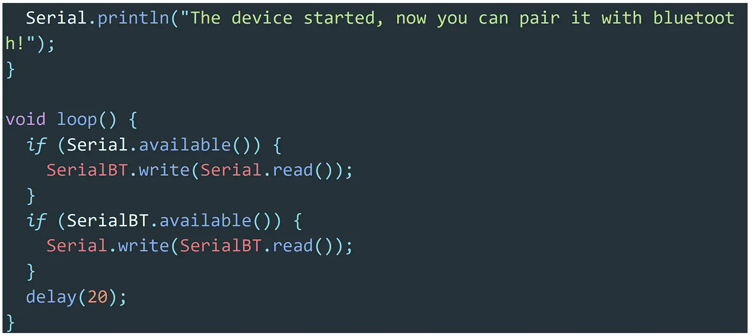 Open the Arduino IDE and open the example program `File`->`Examples`->`BluetoothSerial`->`SerialToSerialBT`.