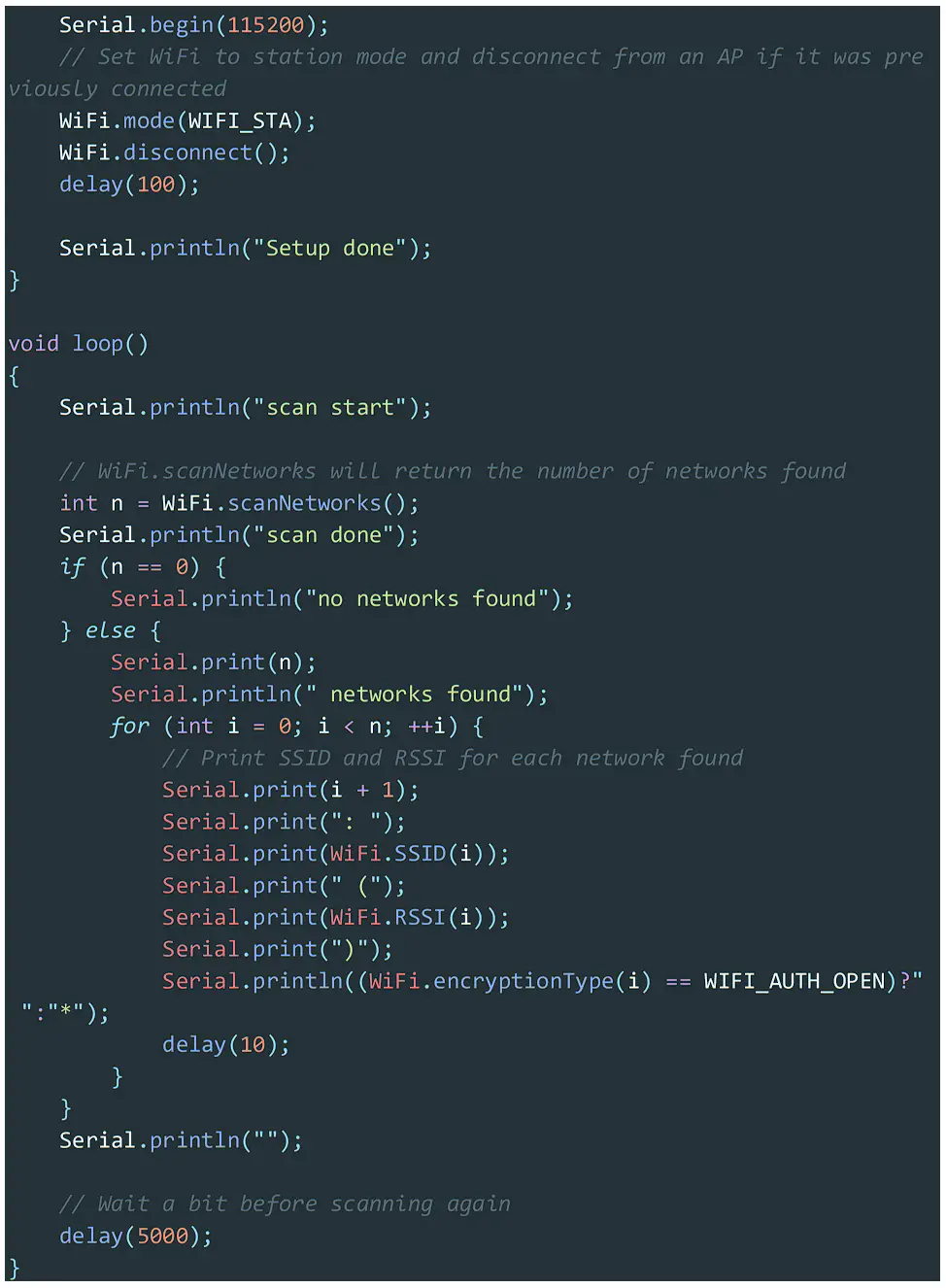Open the Arduino IDE and open the example program `File`->`Examples`->`WiFi`->`WiFiScan`. Connect the device to the computer and select the corresponding port to burn. After completion, the device will automatically run the WiFi scan, and the current WiFi scan result can be obtained through the serial port monitor that comes with the Arduino.