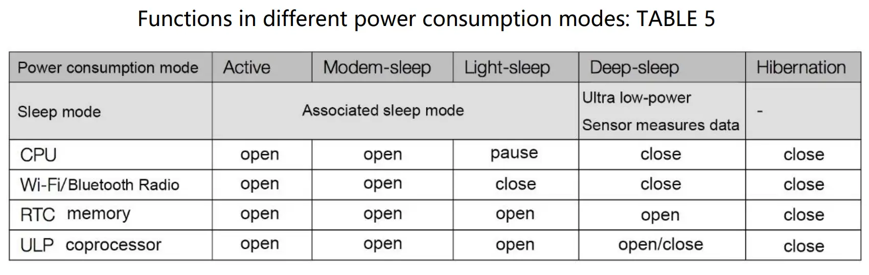 ESP32 uses advanced power management techniques may be switched between different power saving modes. (See Table 5).